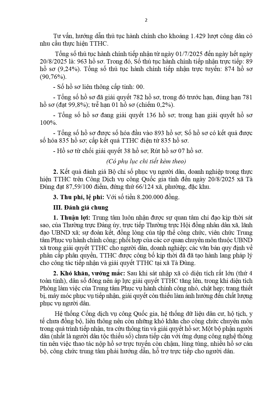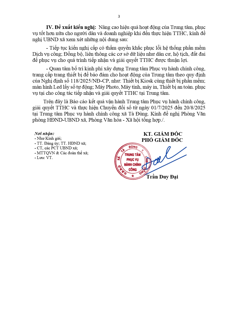 Báo cáo Kết quả vận hành Trung tâm Phục vụ hành chính công, giải quyết TTHC và thực hiện Chuyển đổi số từ ngày 01/7/2025 đến 20/8/2025