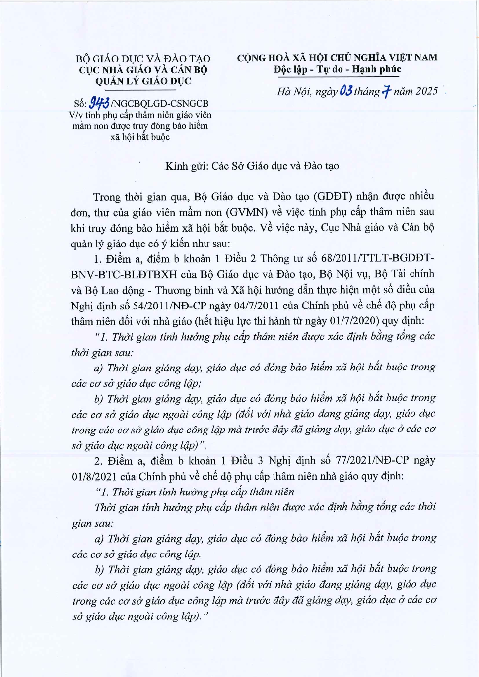 Công văn 943/NGCBQLGD-CSNGCB, ngày 03/07/2025 về việc tính phụ cấp thâm niên giáo viên mầm non được truy đóng bảo hiểm xã hội bắt buộc