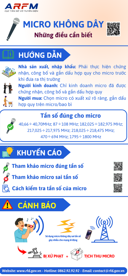 Nếu có thắc mắc về micro không dây có thể phản ánh qua email: contact@rfd.gov.vn hoặc gọi điện thoại đến số: 0862.92.92.92 của Cục Tần số vô tuyến điện – Bộ Khoa học và Công nghệ trong giờ hành chính để được giải đáp.