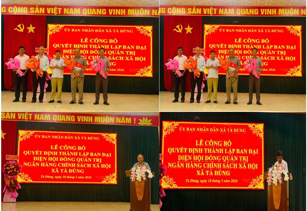 Căn cứ Nghị định số 06/2026/NĐ-CP ngày 10/01/2026 của Chính phủ về quy định tổ chức hoạt động của NHCSXH. Ngày 18/3/2026 UBND xã Tà Đùng tổ chức Lễ công bố Quyết định thành lập Ban đại diện Hội đồng quản trị Ngân hàng Chính sách xã hội xã Tà Đùng và tổ chức phiên họp thứ nhất của Ban đại diện để phân công nhiệm vụ cho các thành viên và triển thực hiện nhiệm vụ theo quy định của Nghị định số 06/2026/NĐ-CP.