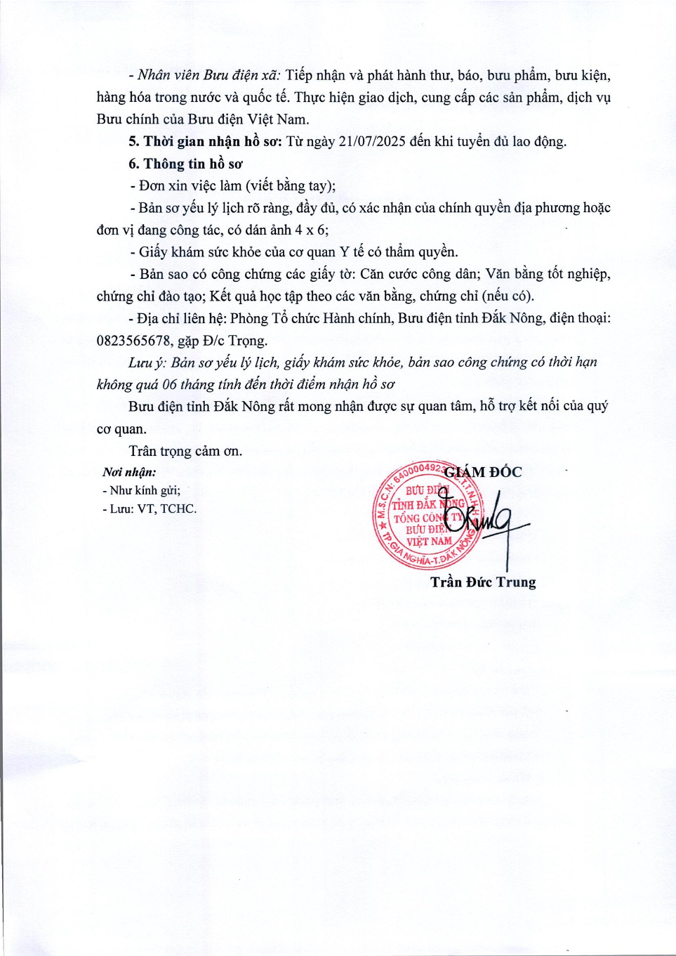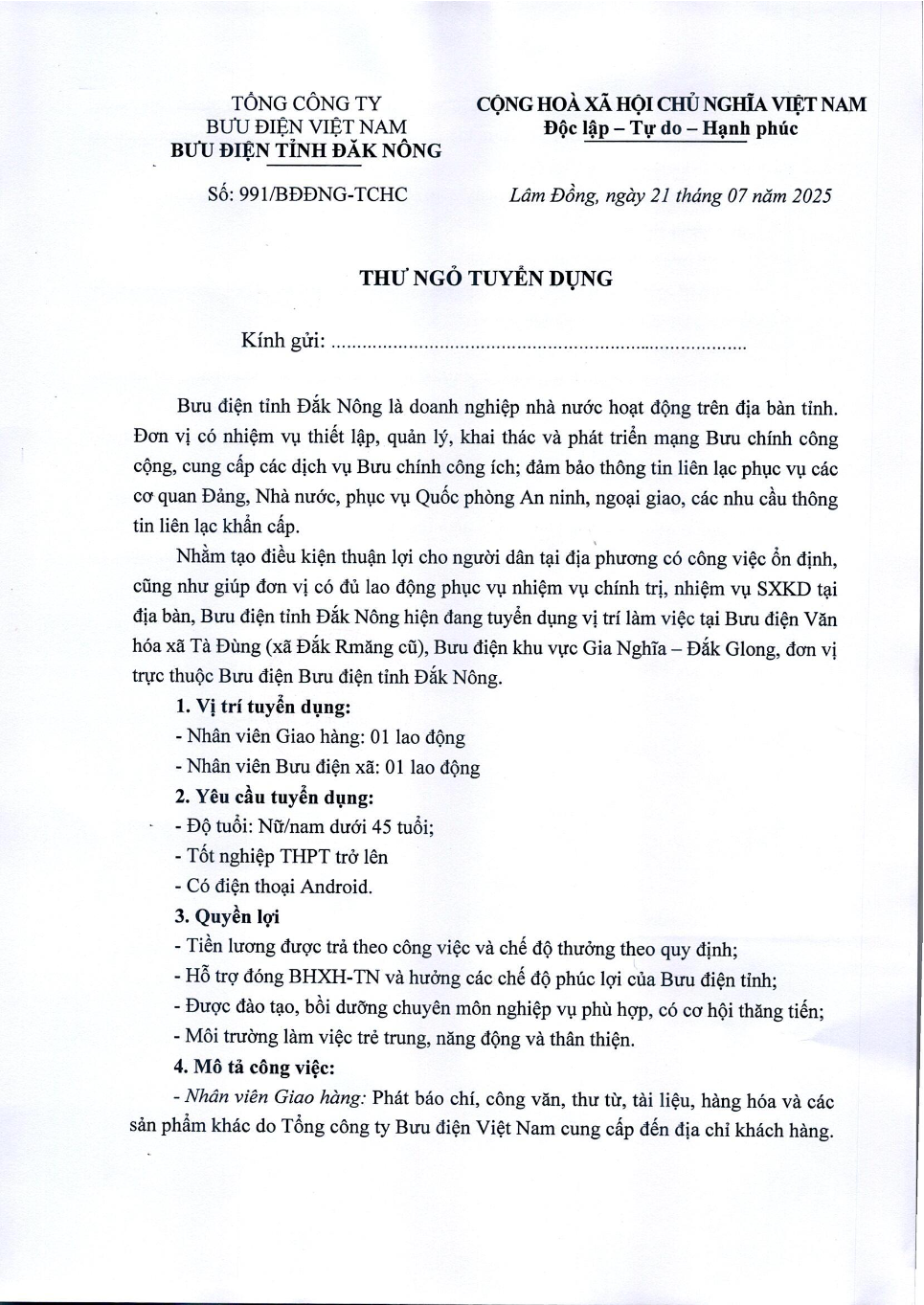 Tuyển dụng Thư ngỏ tuyển dụng – Bưu điện tỉnh Đắk Nông Your browser does not support the audio element.   18/09/2025 16:29 |   26 |  Thư ngỏ tuyển dụng – Bưu điện tỉnh Đắk Nông