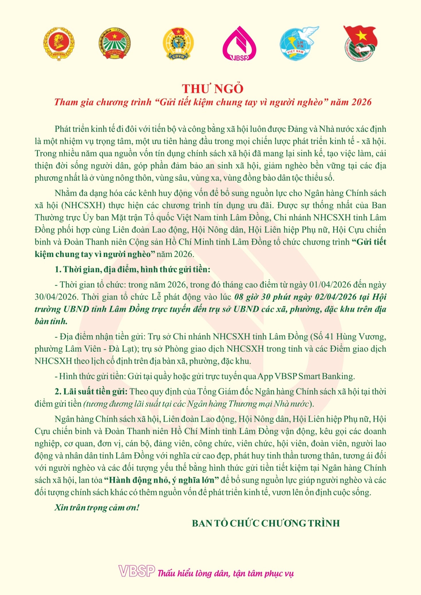Ủy ban nhân dân xã Tà Đùng đề nghị các tổ chức, cá nhân tích cực tham gia chương trình “Gửi tiết kiệm chung tay vì người nghèo” năm 2026.